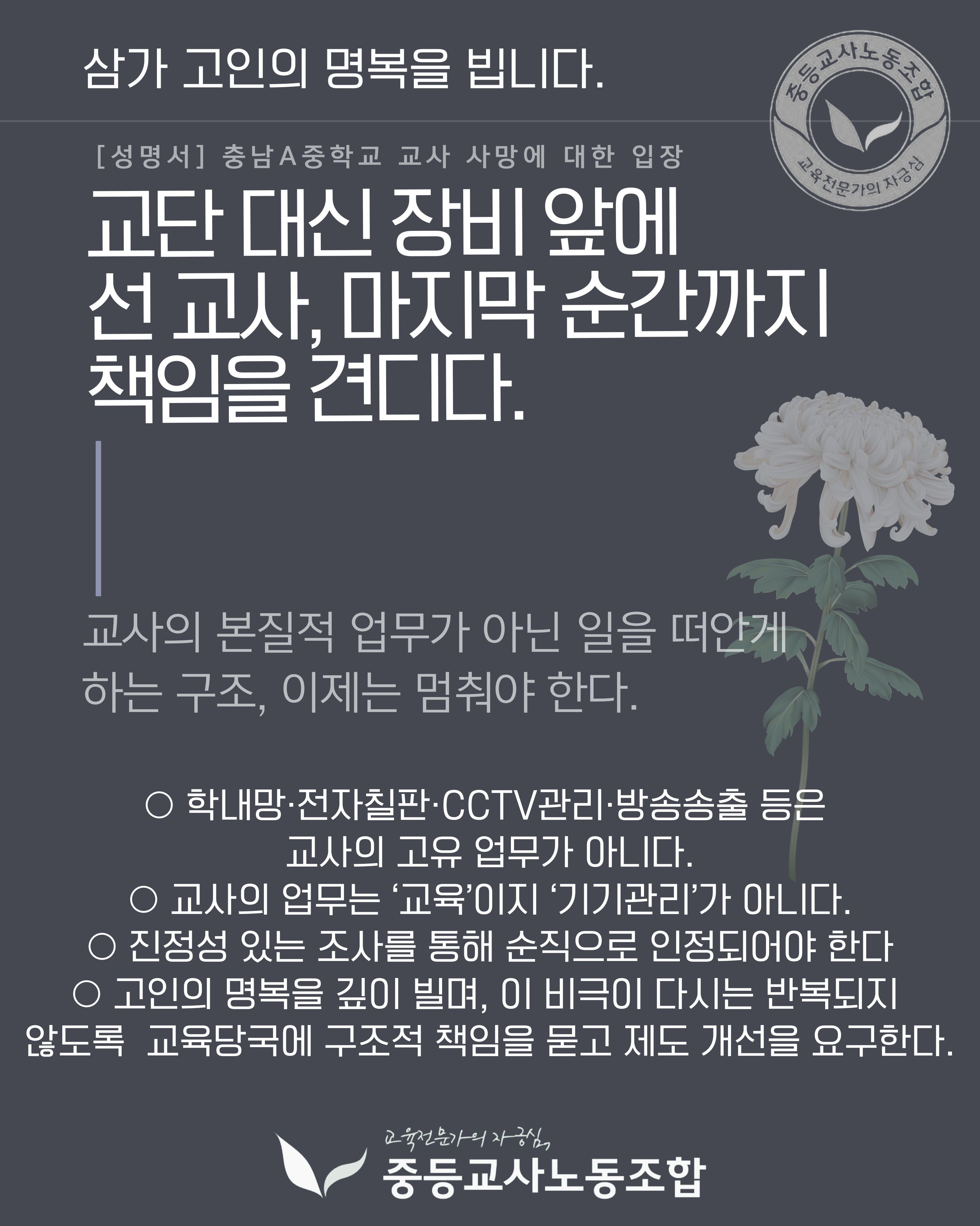 [성명서] 충남 A중학교 교사 사망에 대한 전국중등교사노동조합의 입장