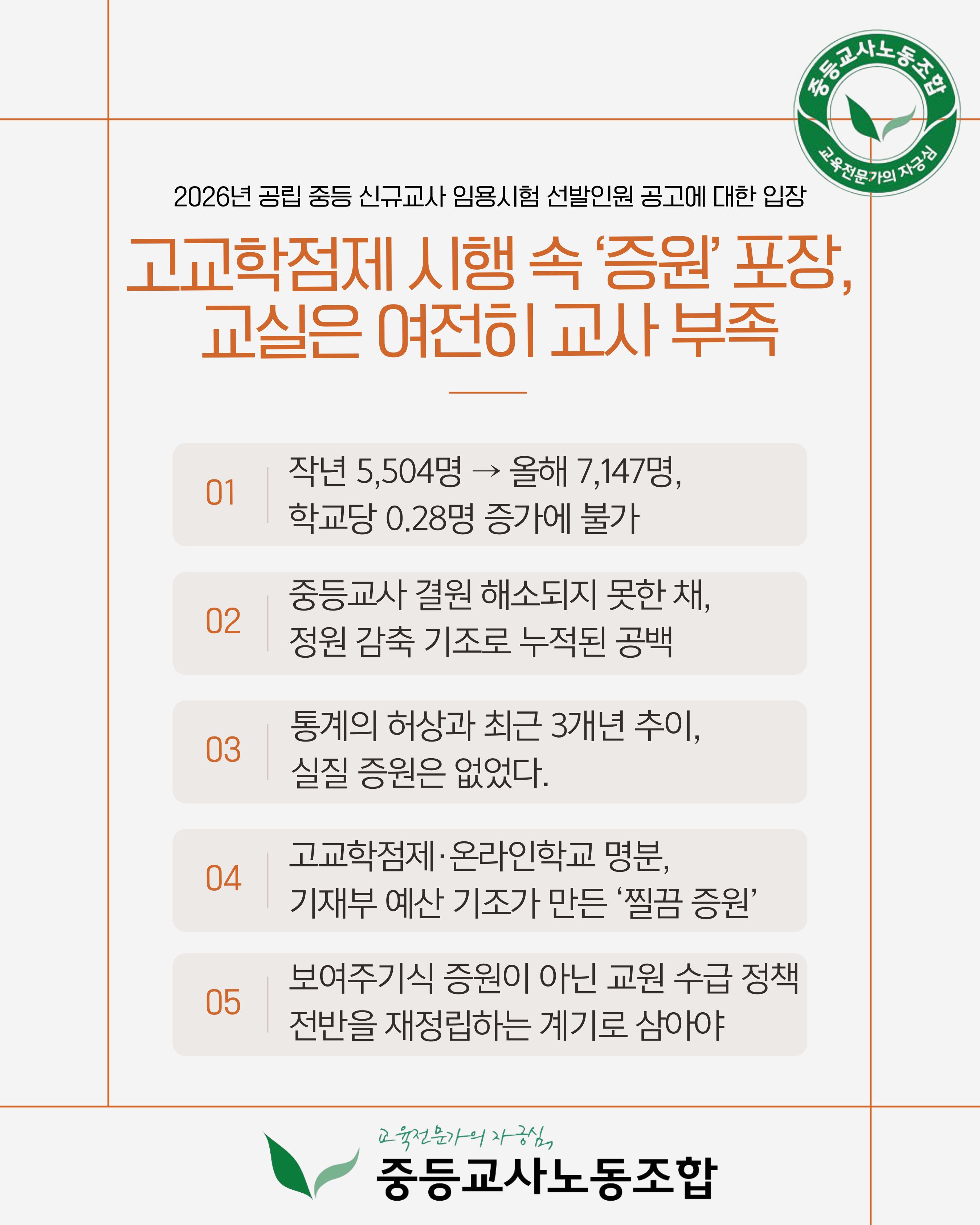 중등교사노조 – 2026년 공립 중등 신규교사 임용시험 선발인원 공고에 대한 입장