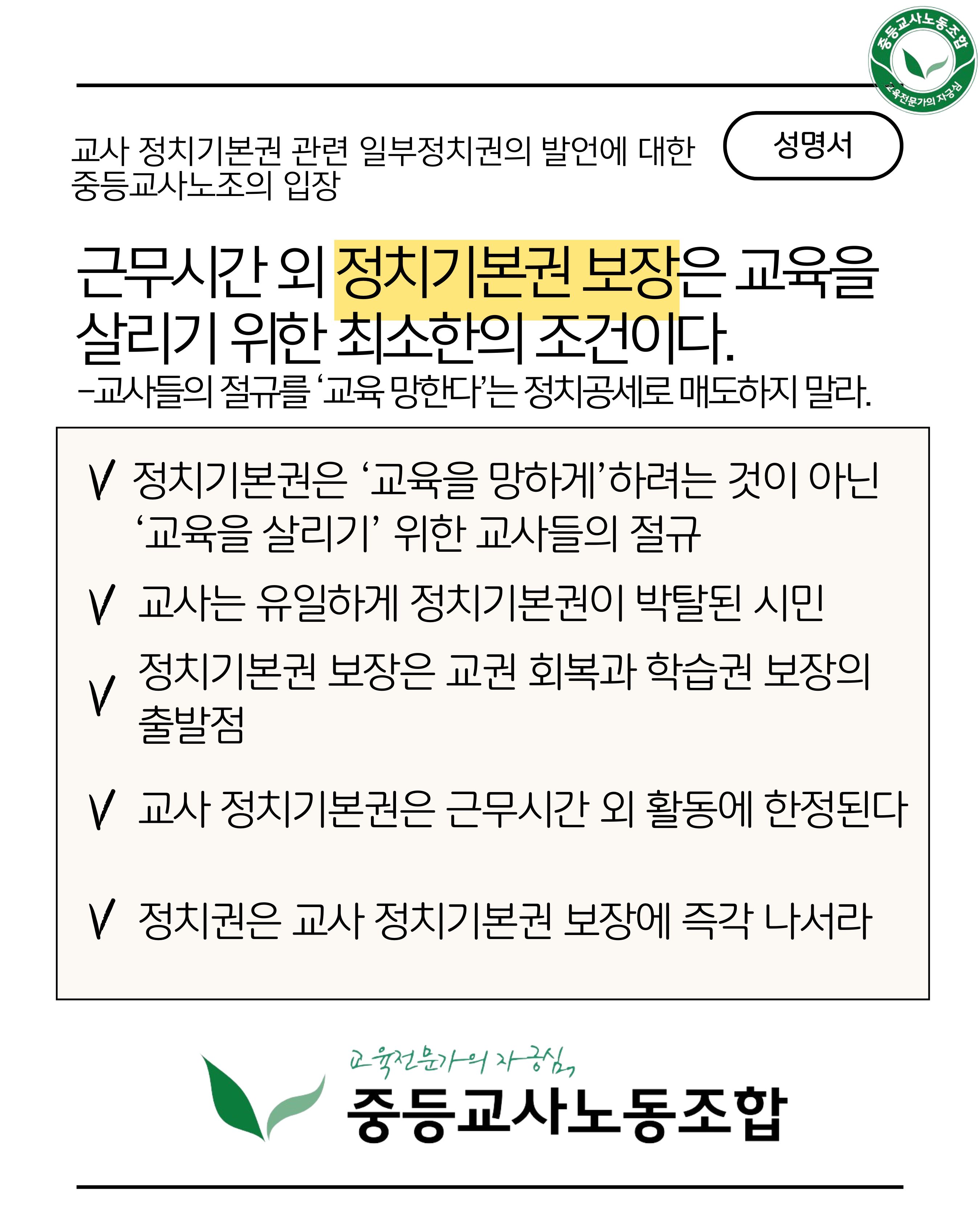 교사 정치기본권 관련 일부 정치권 발언에 대한 중등교사노조의 입장
