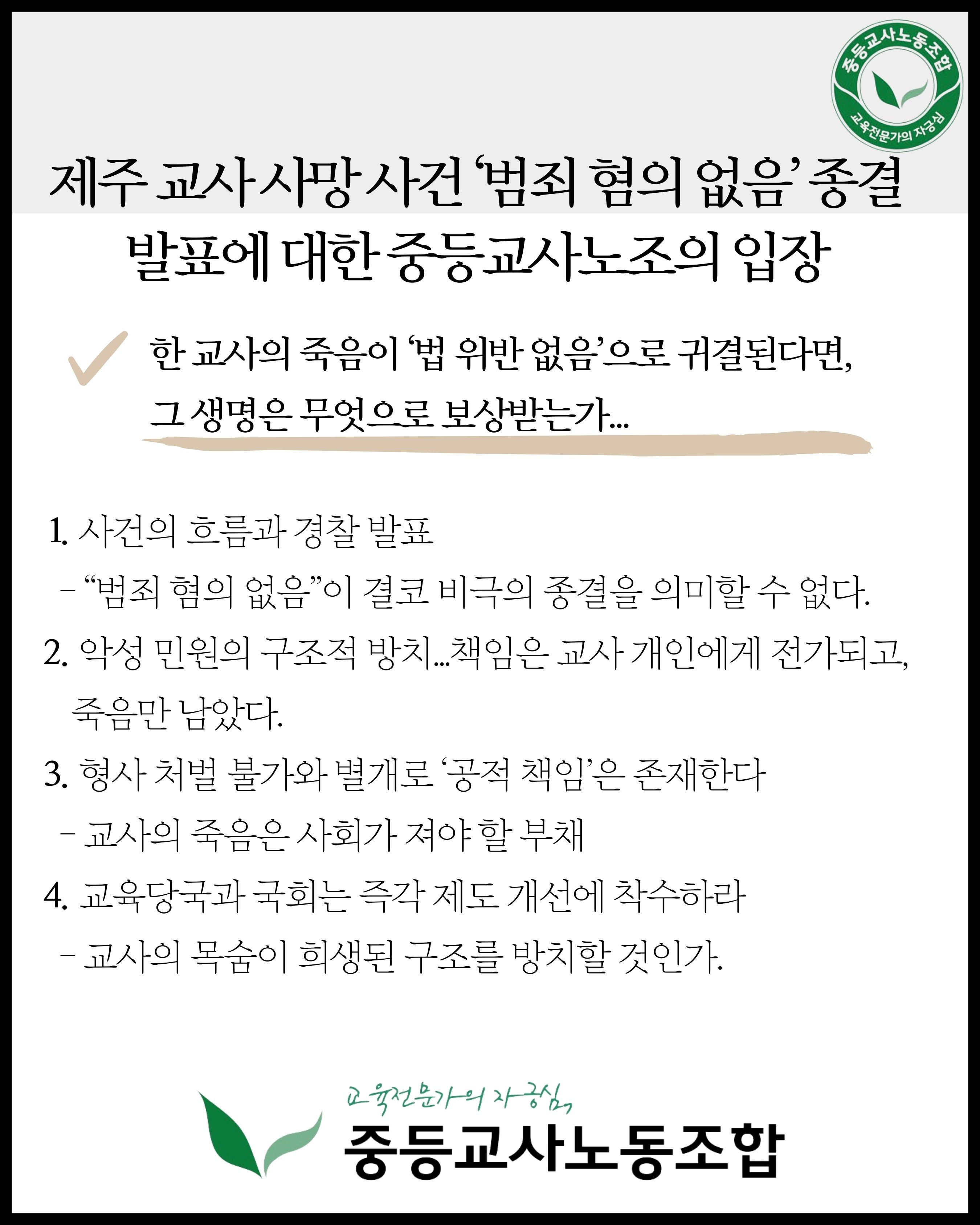 [입장문] 제주 교사 사망사건 ‘범죄 혐의 없음’ 종결 발표에 대한 중등교사노조의 입장