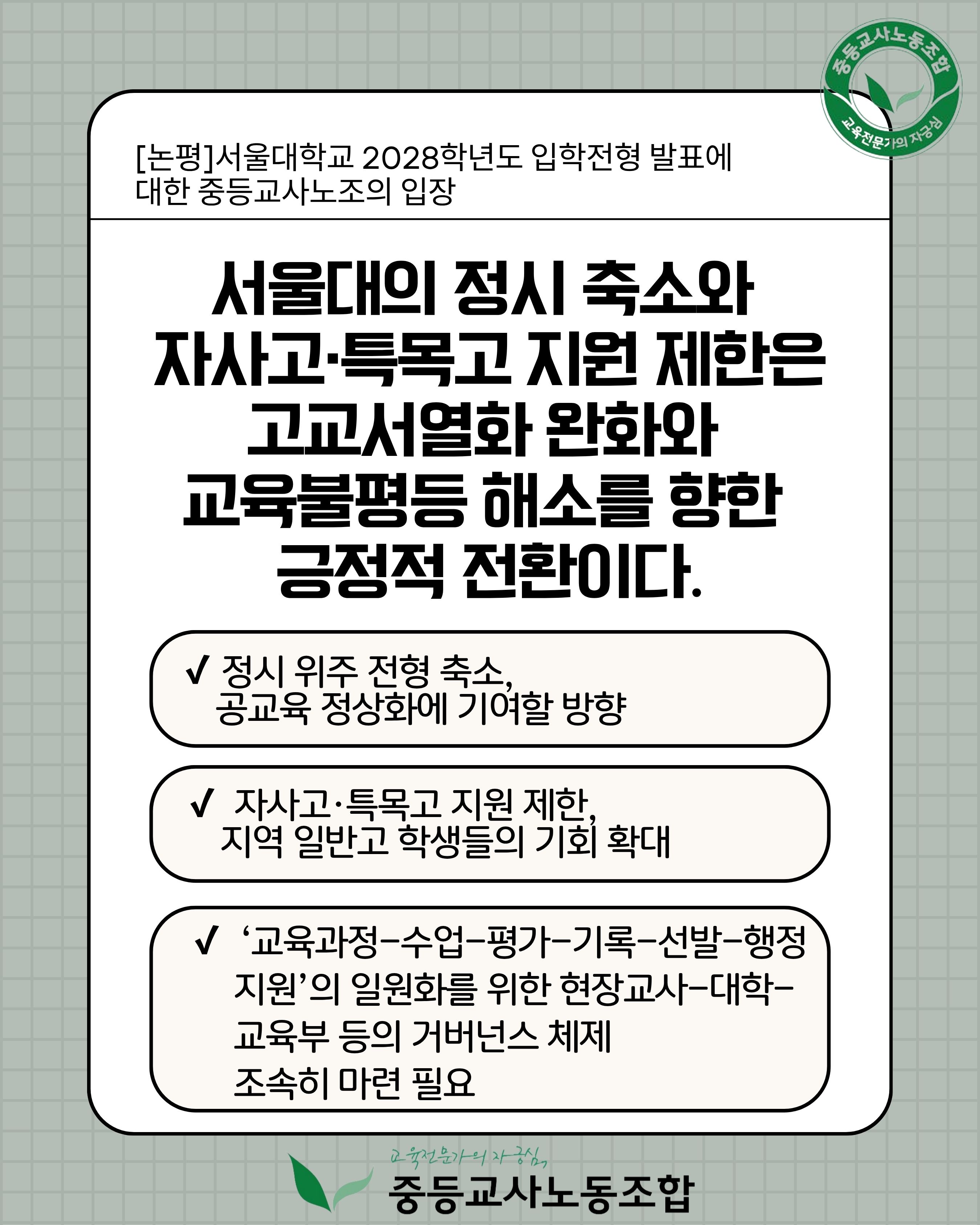 서울대학교 2028학년도 입학전형 발표에 대한 중등교사노조의 입장