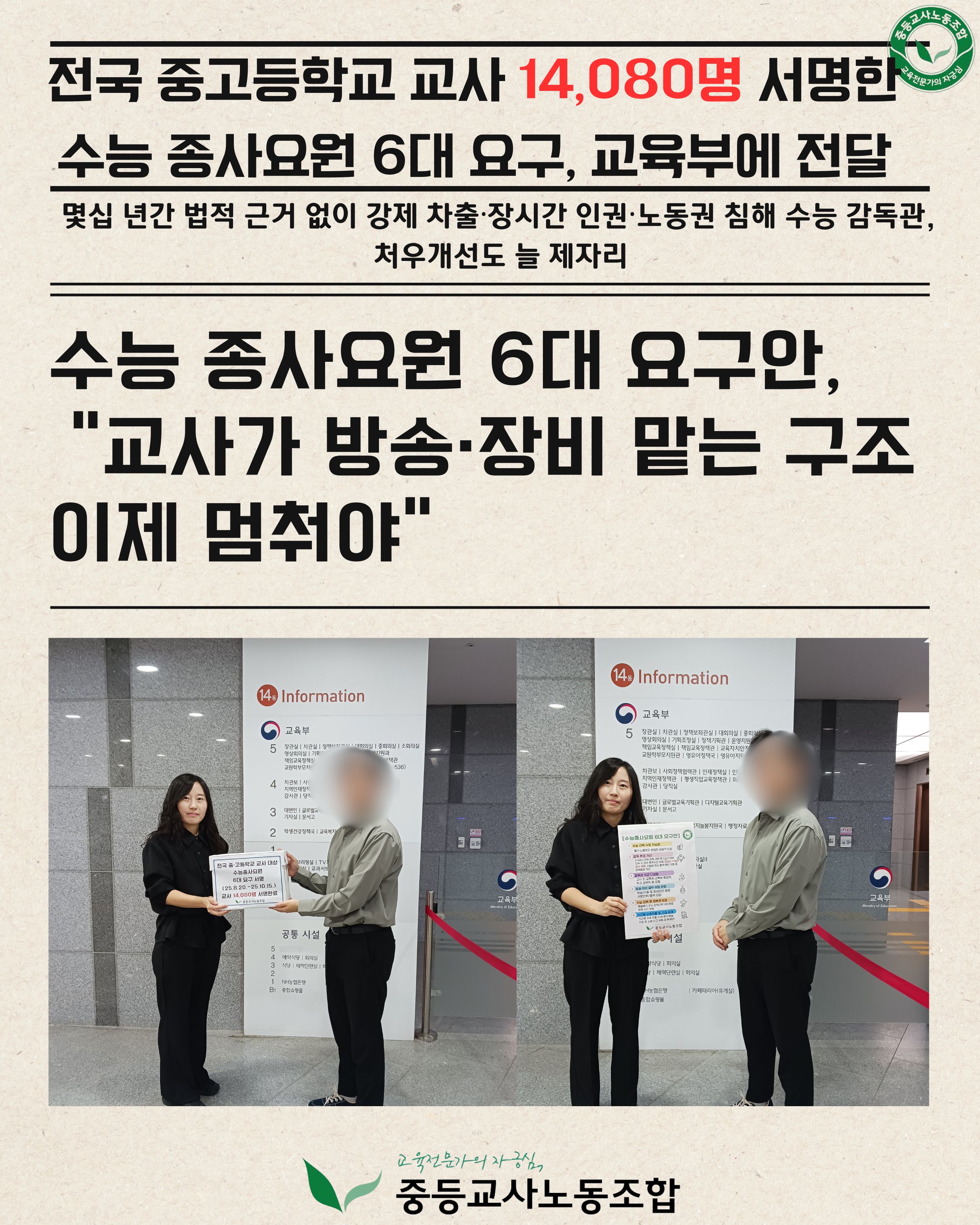 전국 중·고등학교 교사 14,080명 서명한 수능 종사요원 6대 요구, 교육부에 전달
